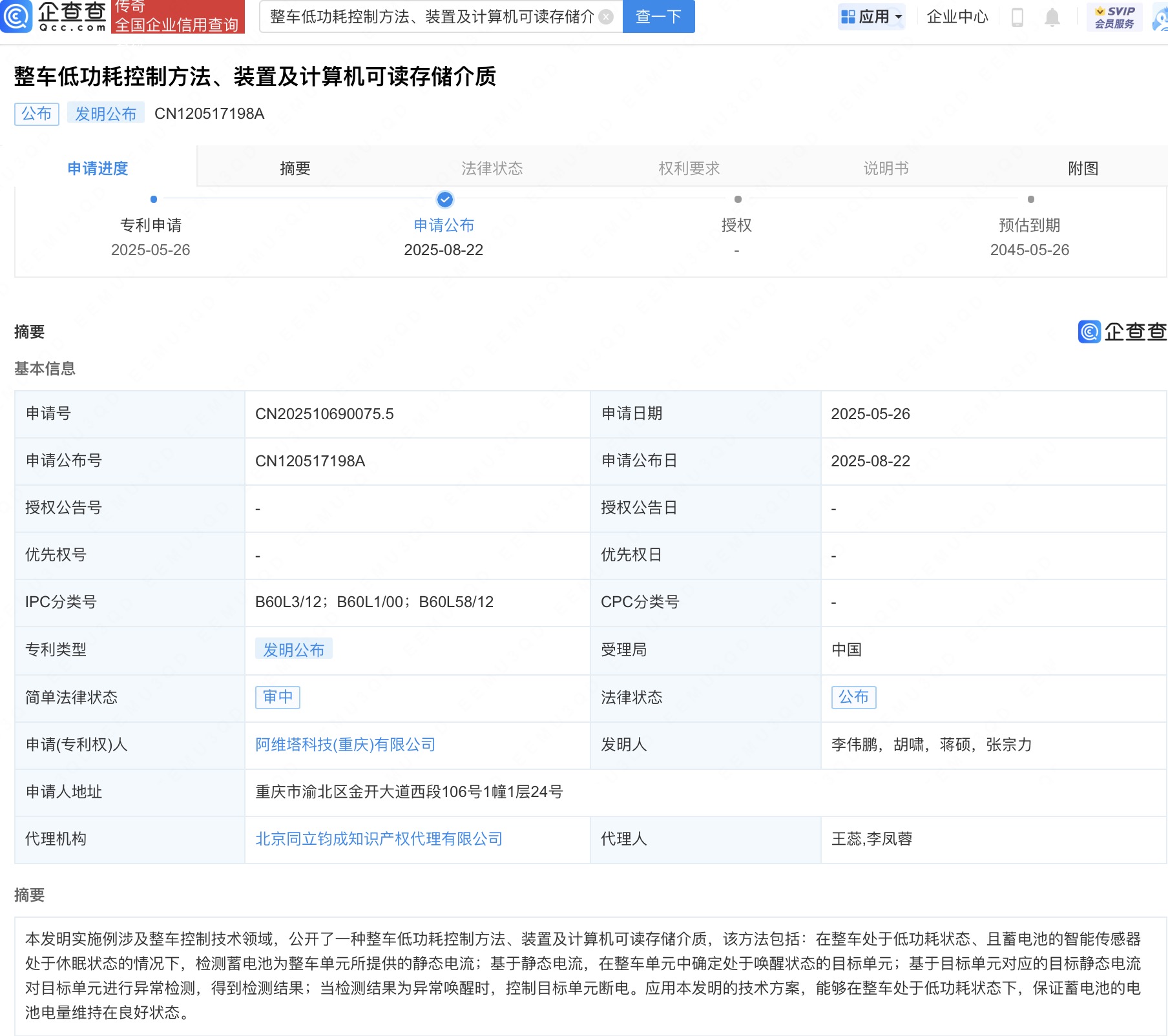 近日,阿维塔科技(重庆)有限公司“整车低功耗控制方法、装置及计算机可读存储介质”专利公布。企查查专利摘要显示,本发明实施例涉及整车控制技术领域。该方法包括:在整车处于低功耗状态、且蓄电池的智能传感器处于休眠状态的情况下,检测蓄电池为整车单元所提供的静态电流;基于静态电流,在整车单元中确定处于唤醒状态的目标单元;基于目标单元对应的目标静态电流对目标单元进行异常检测,得到检测结果;当检测结果为异常唤醒时,控制目标单元断电。应用本发明的技术方案,能够在整车处于低功耗状态下,保证蓄电池的电池电量维持在良好状态。